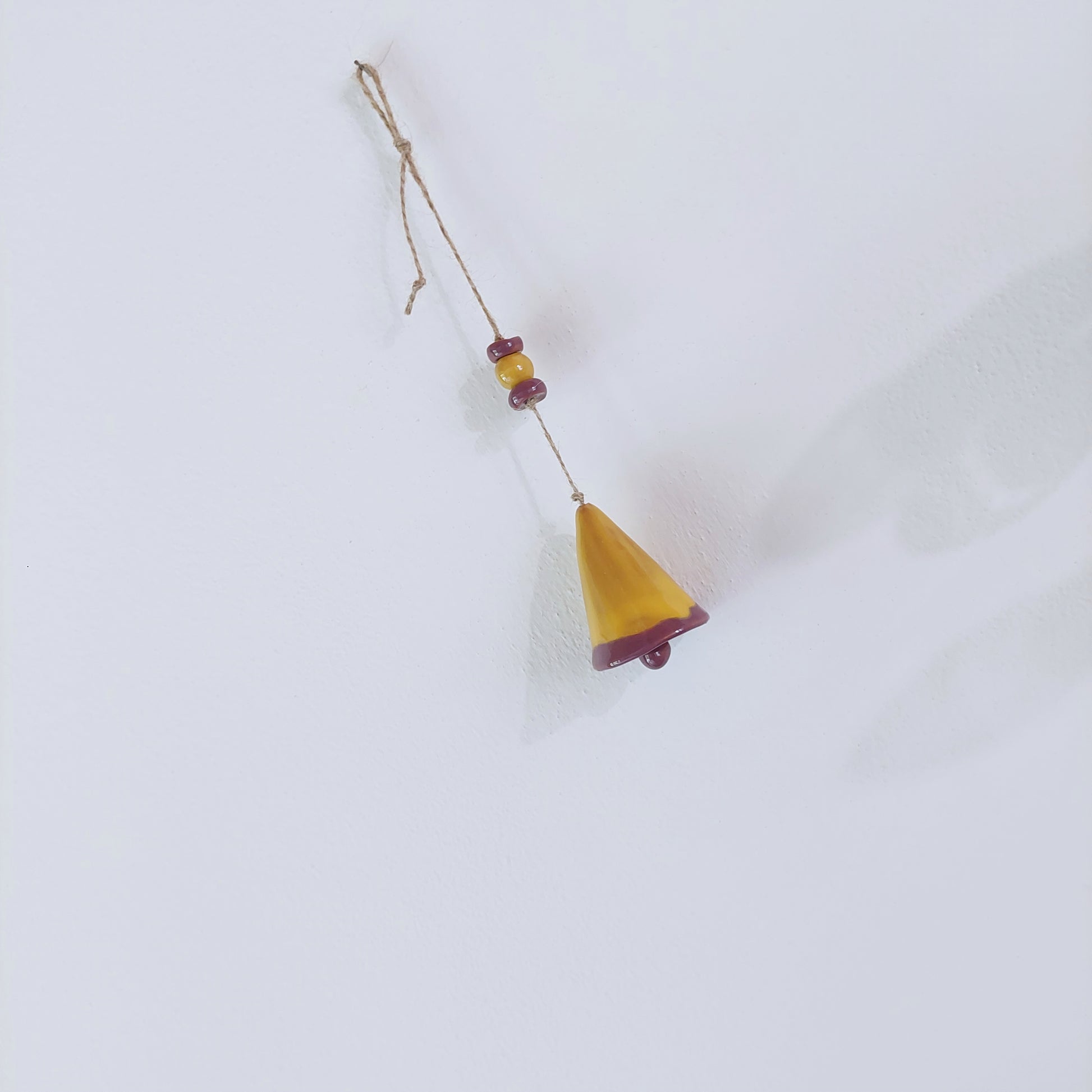 Campanella in ceramica "Pensieri felici" giallo ocra e viola decorata con perle in ceramica.