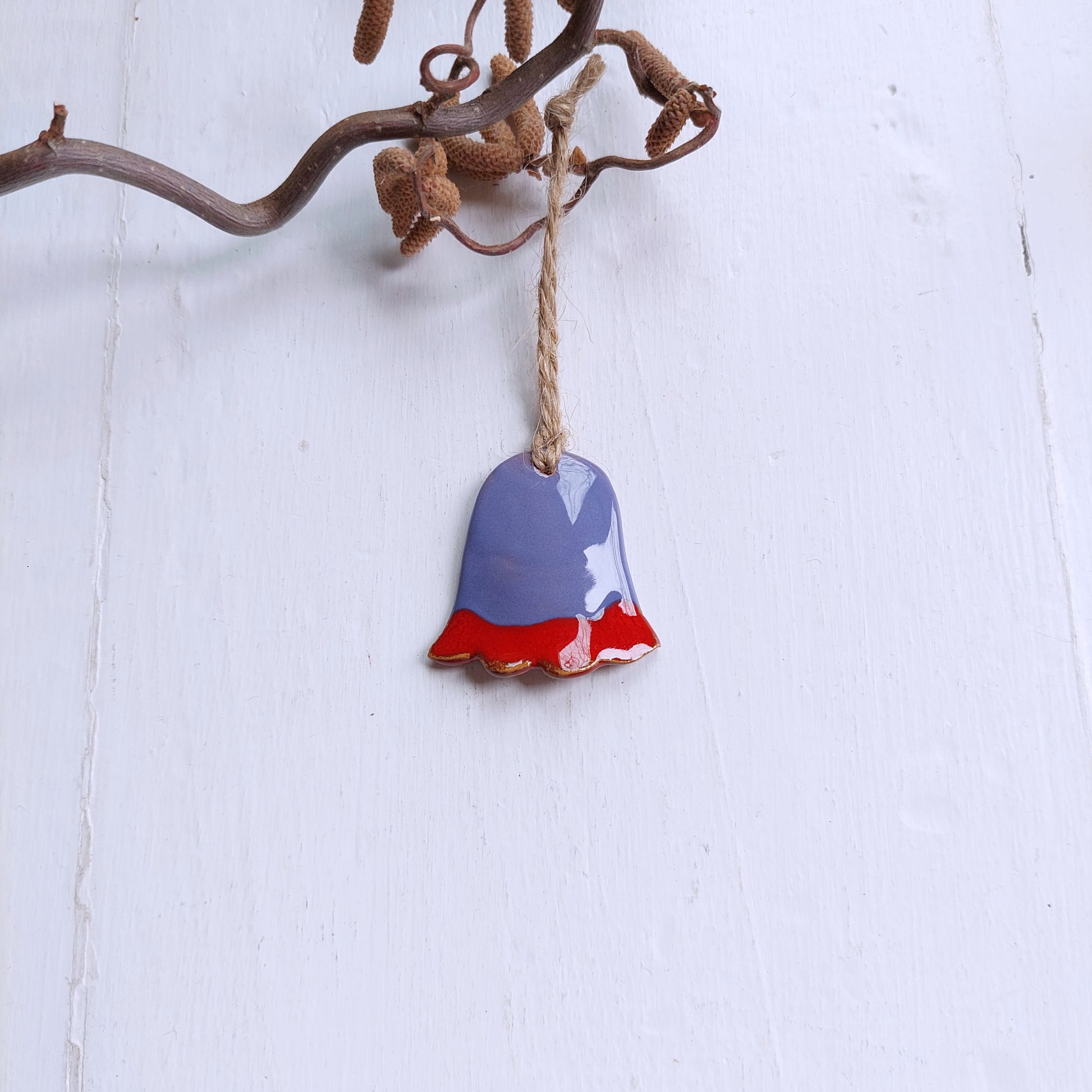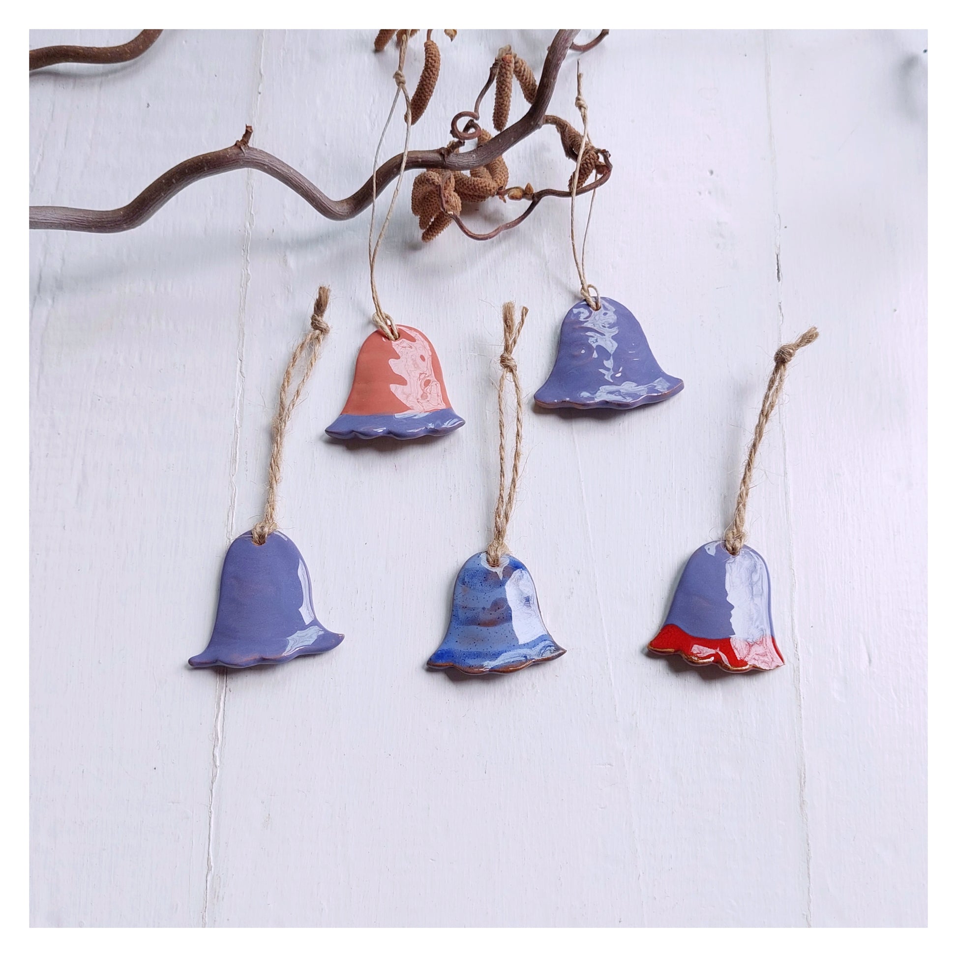 Campanelle in ceramica azzurro e rosa con laccetto in spago.