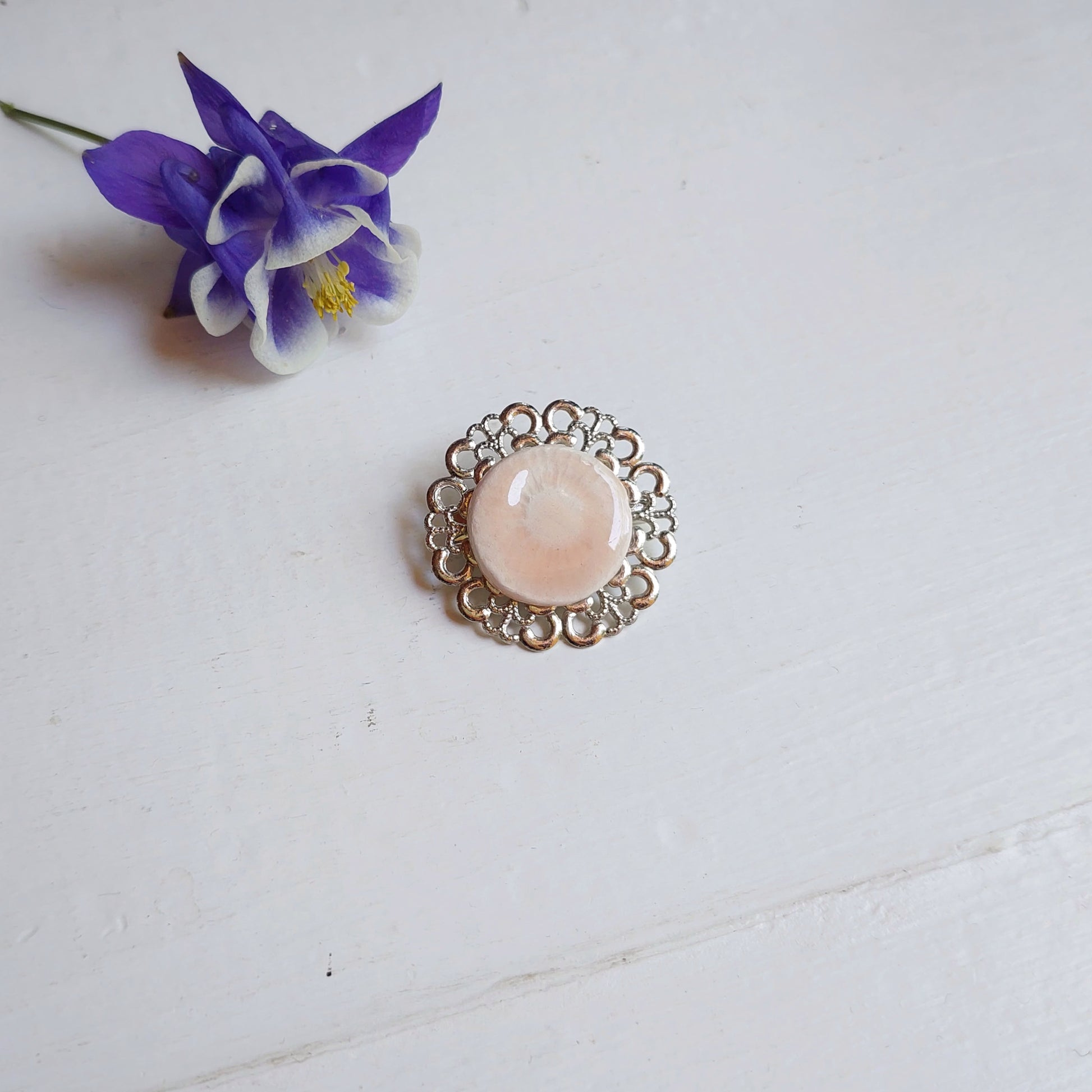 Spilla Romantica con perla in ceramica bianca e supporto con spilla in metallo color argento in quattro varianti colore.