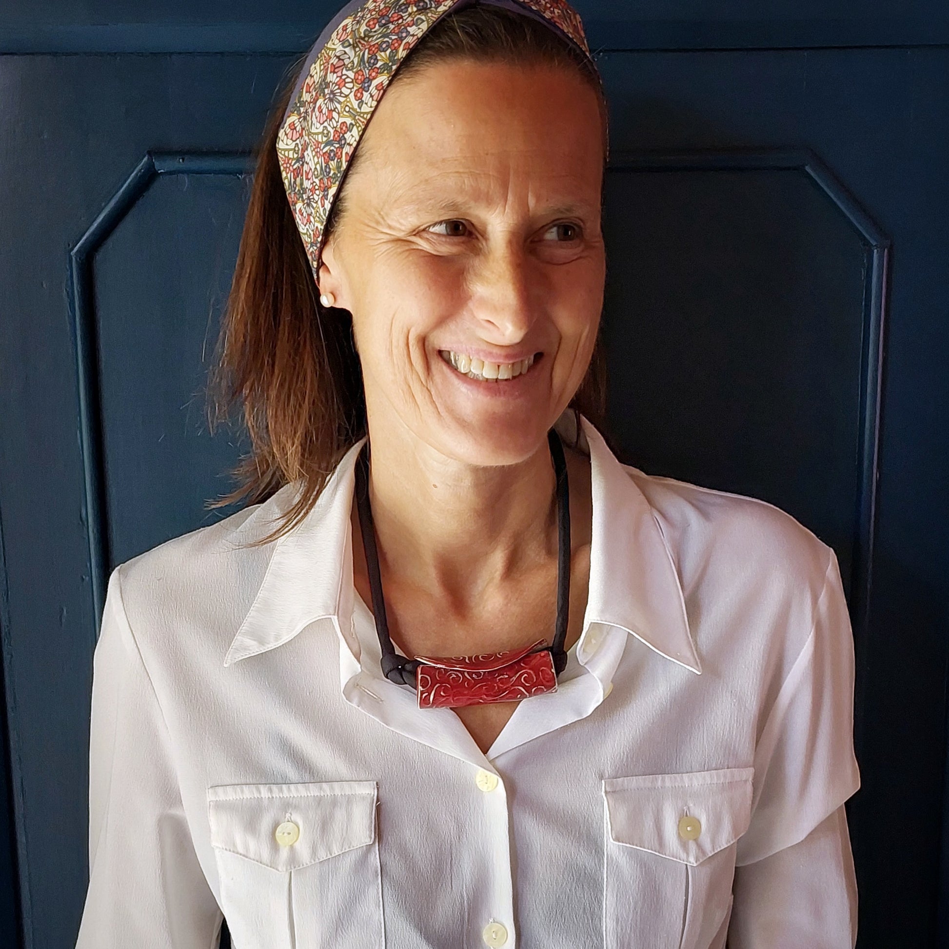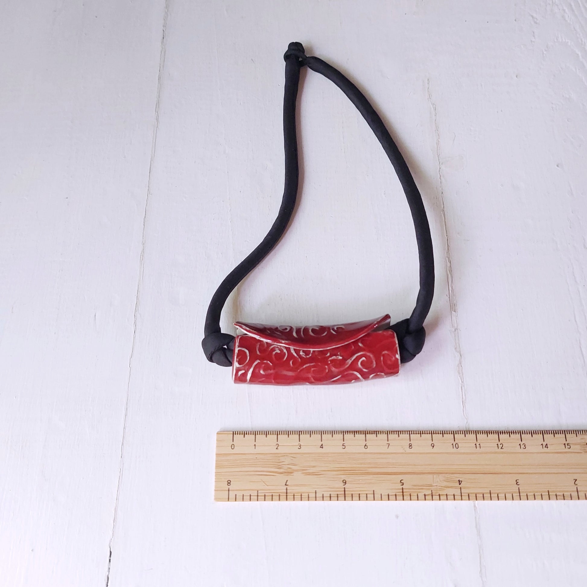 Collana girocollo da donna con perla rossa arricchita da una lavorazione in rilievo che fa risaltare il colore dell'argilla bianca. Il laccio in seta imbottita.