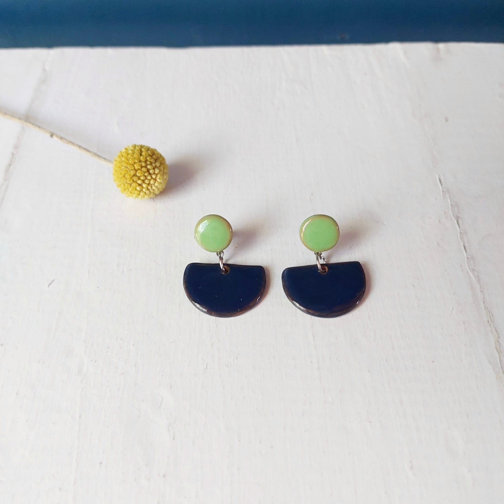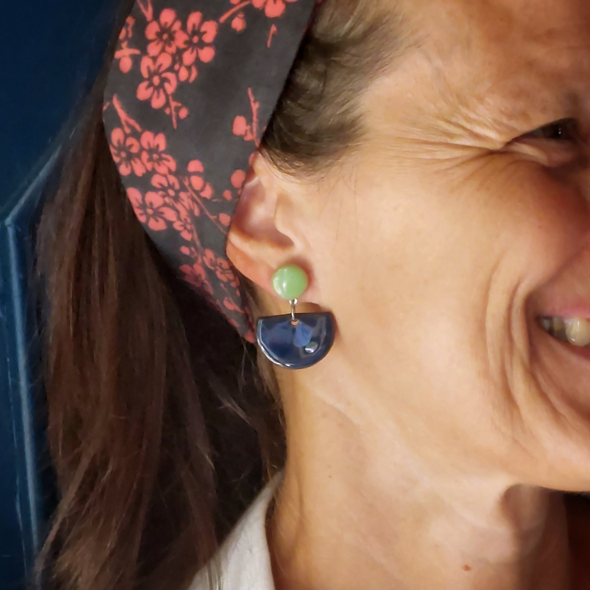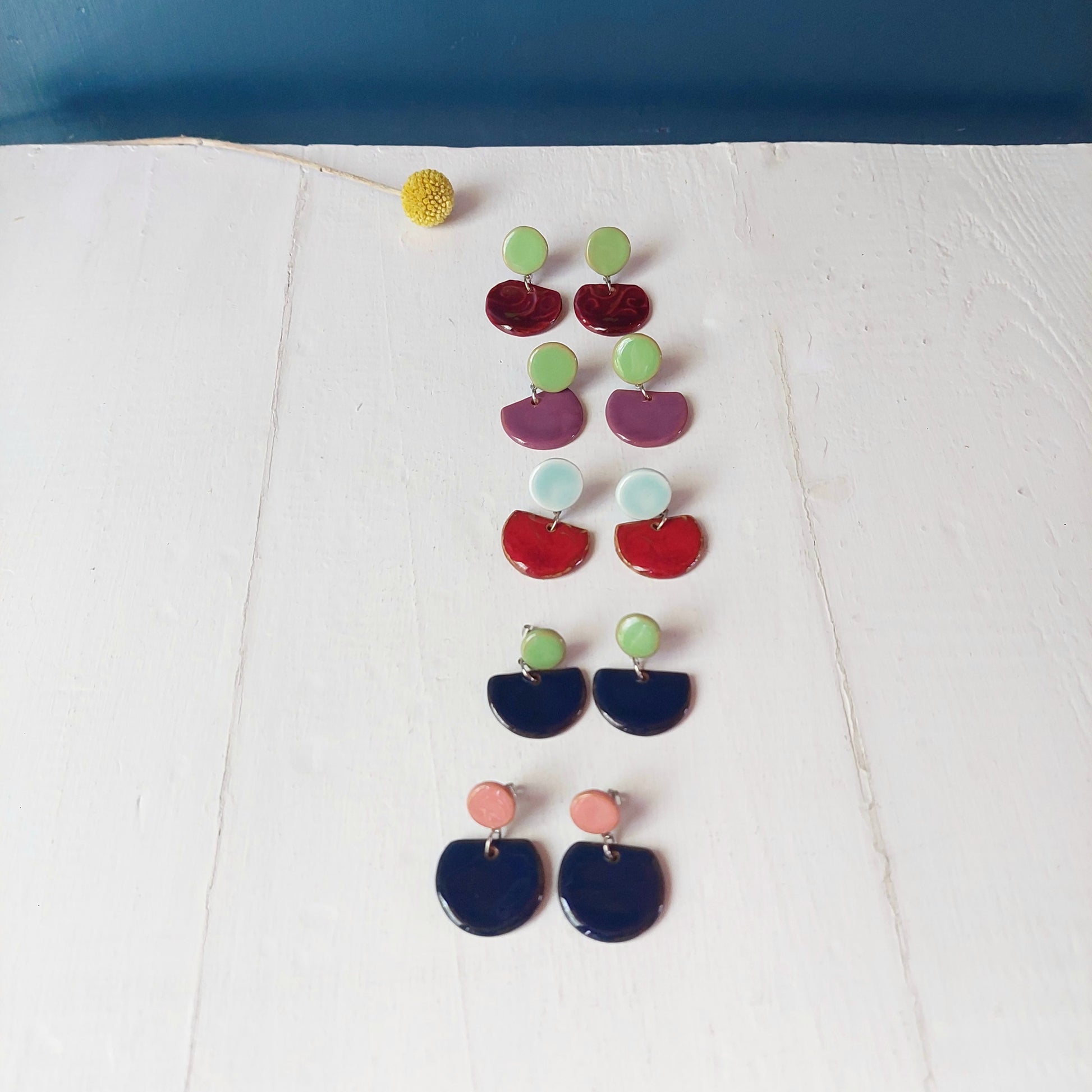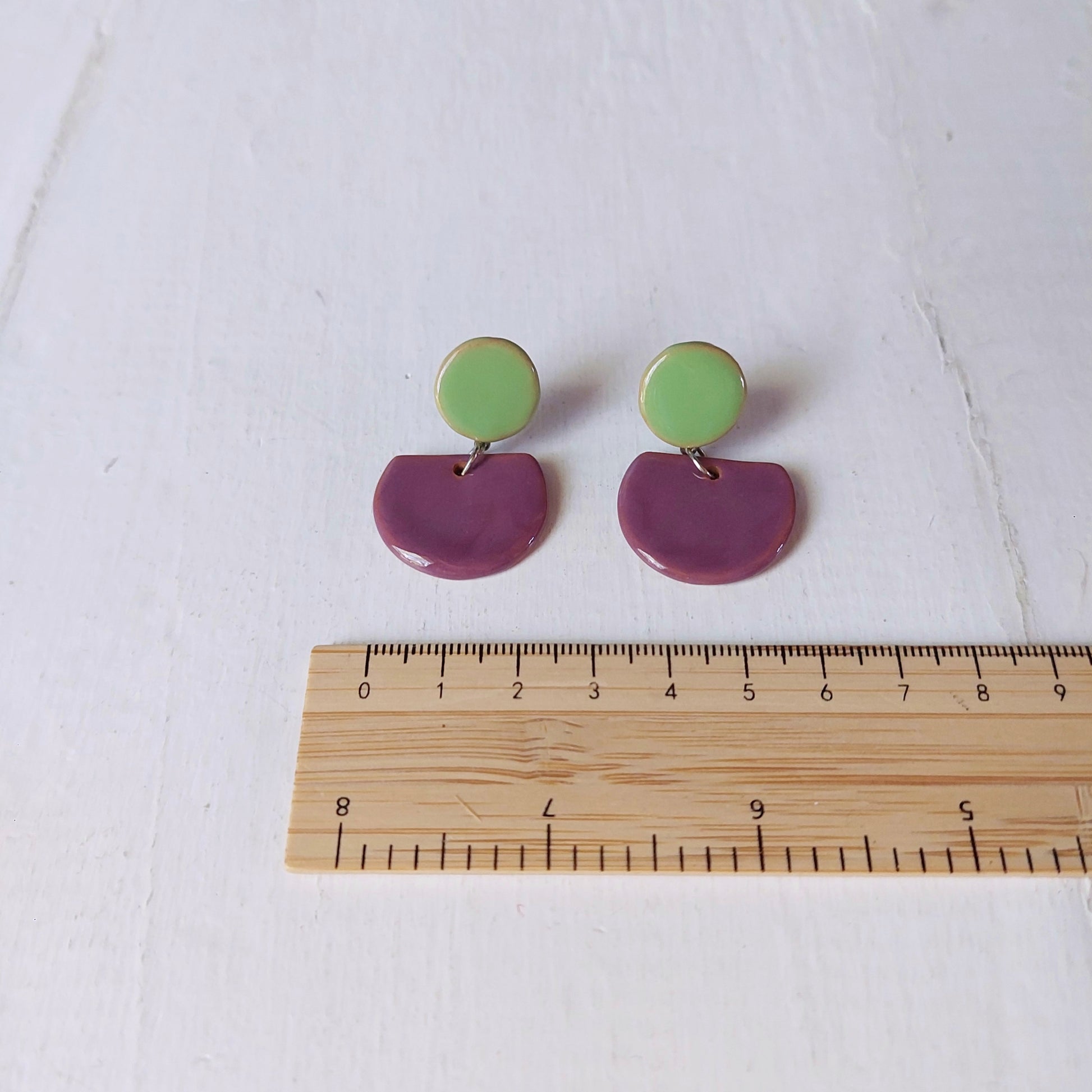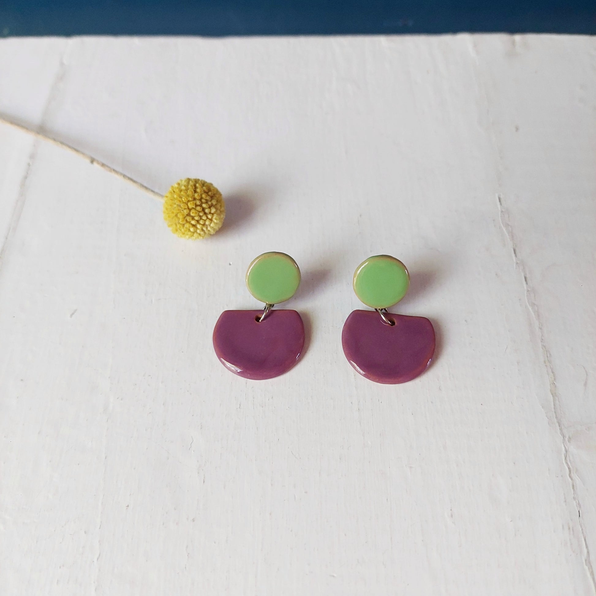Orecchini bicolore in ceramica a lobo rosso bordeaux e verde mela con base in acciaio nickel free.
