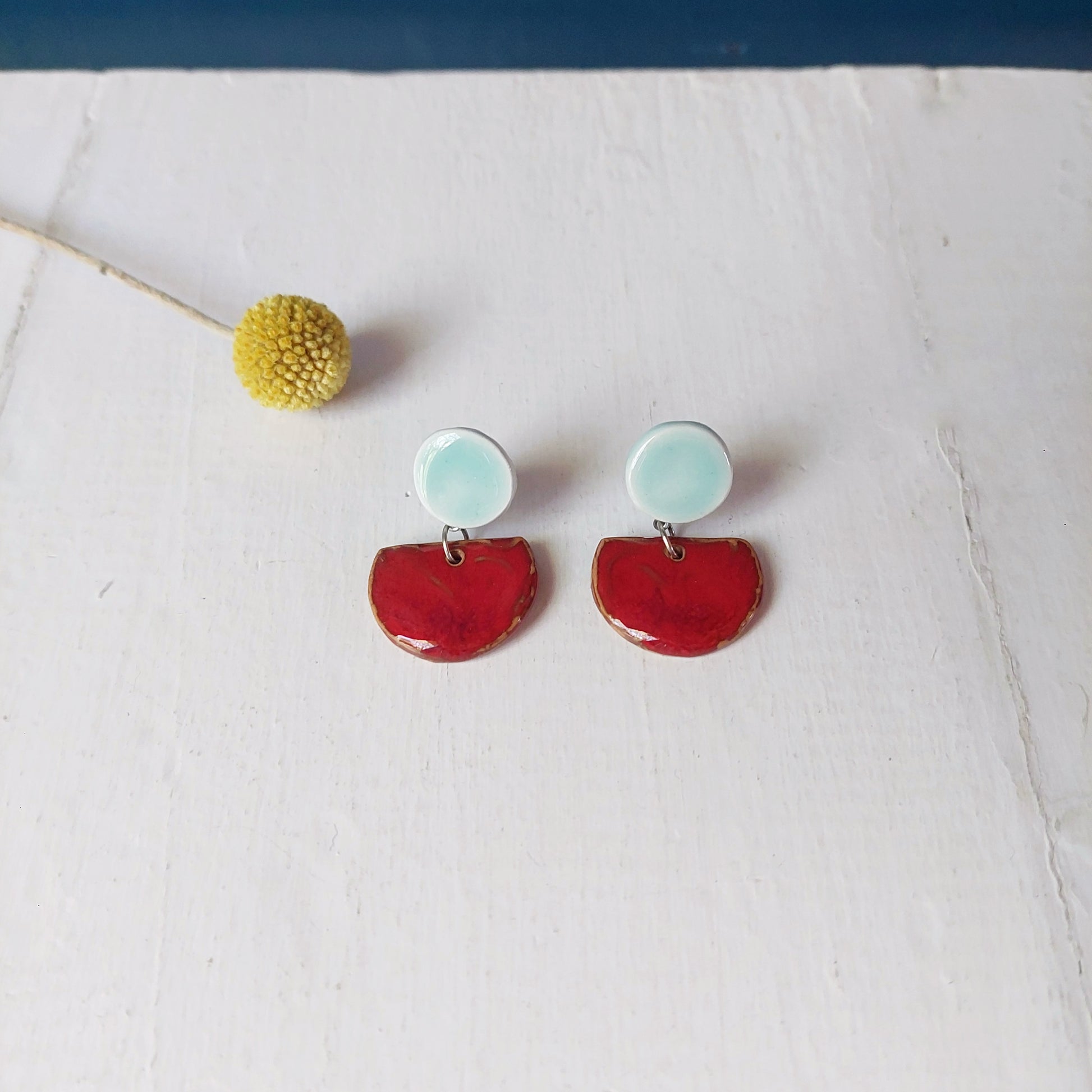 Orecchini Mondi a lobo pendenti in ceramica rossa e verde mela.