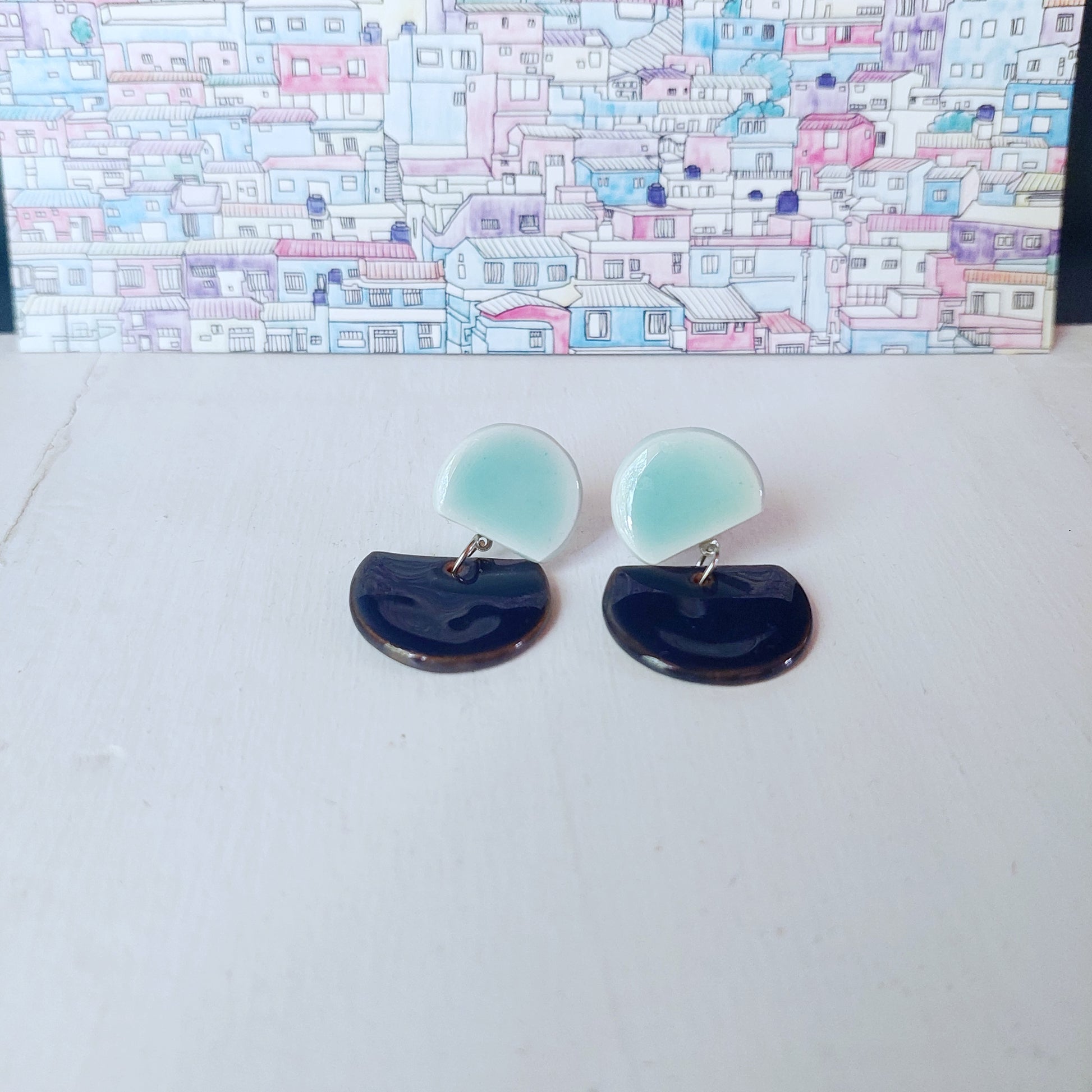 Orecchini Mondi pendenti in ceramica arancione e blu in tre varianti colore con base in acciaio.