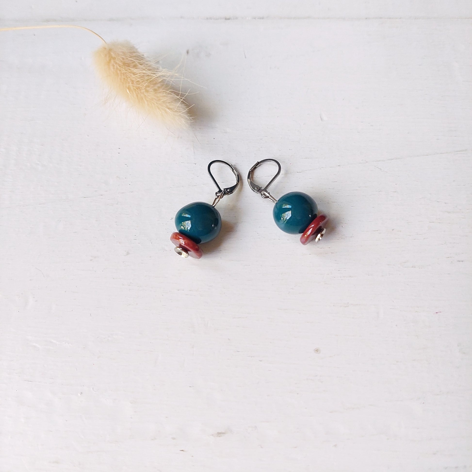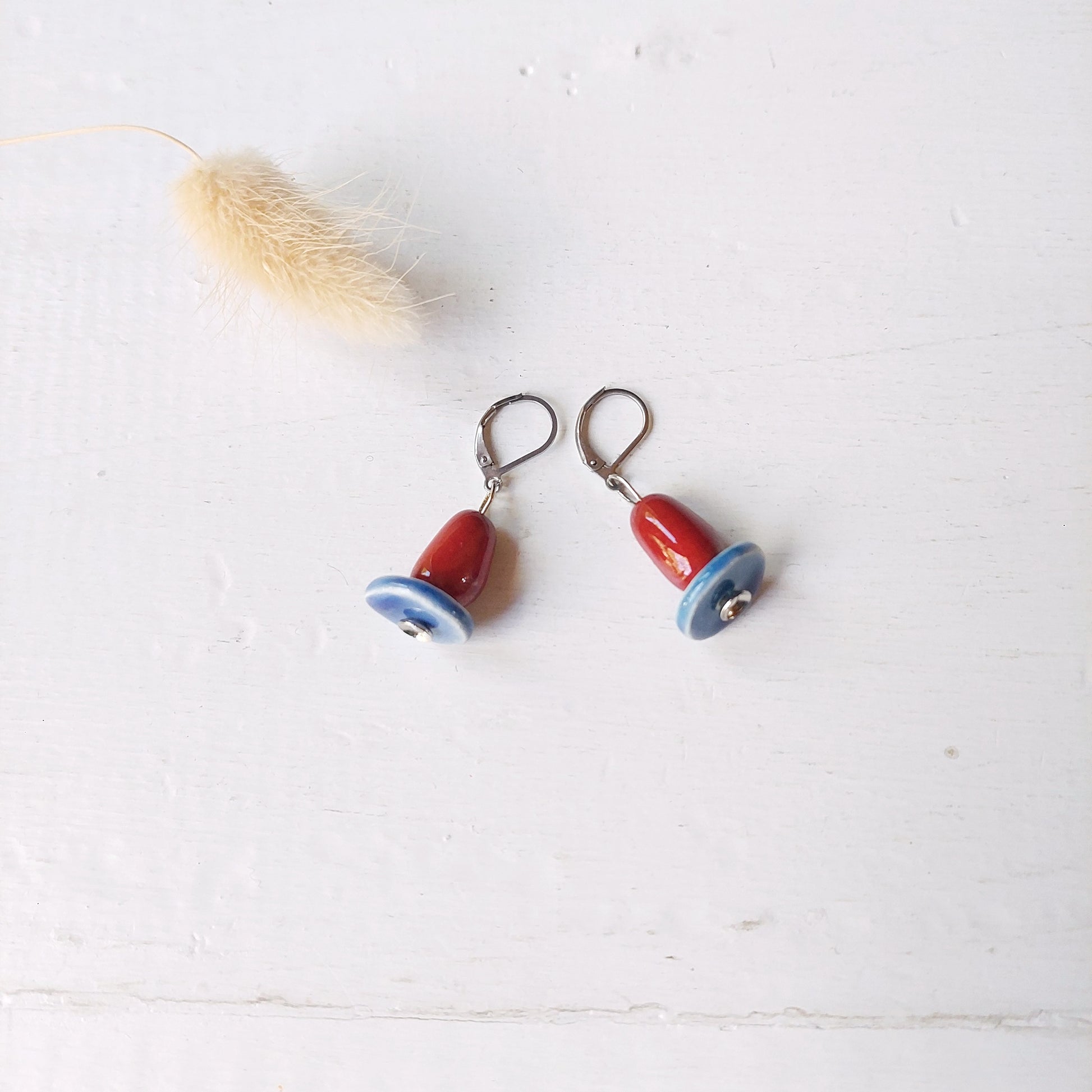 Orecchini Madame pendente bicolore in ceramica bianca e rossa, in cinque varianti colori, con accessorio in acciaio.