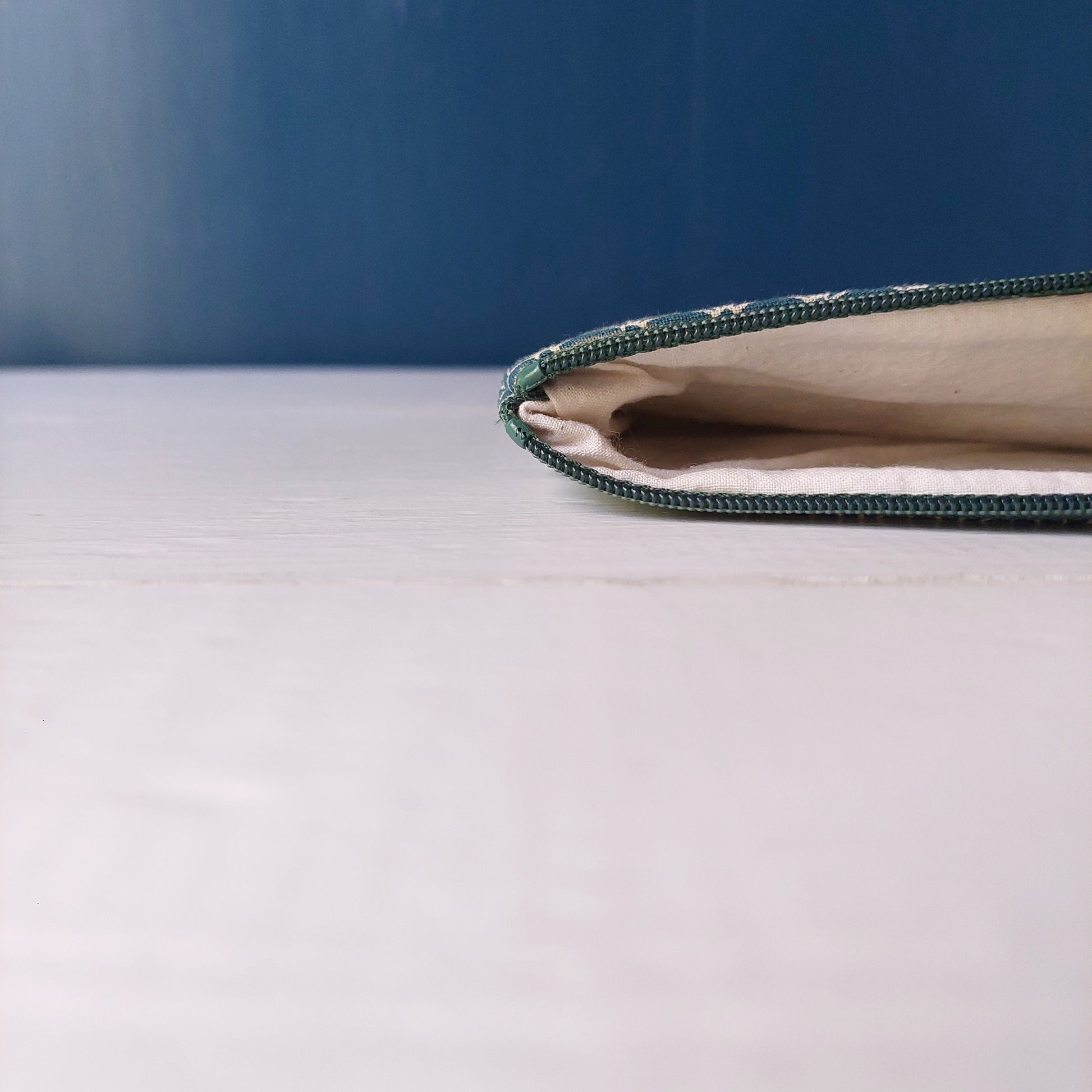 Pochette in cotone Giapponese verde con decorazione geometrica bianca e foderata internamente con cotone bianco.