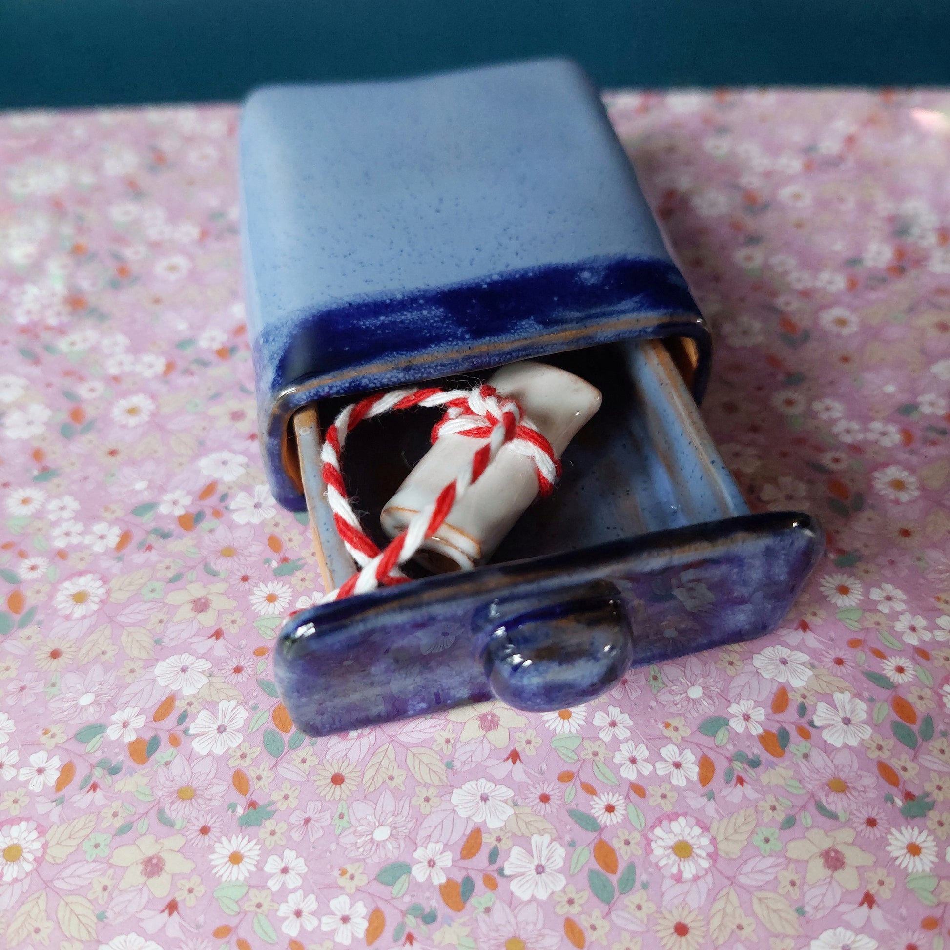 "Il sogno nel cassetto" è una ceramica color azzurro pervinca e blu con all'interno il piccolo foglio di ceramica bianca "Acchiappa sogni".
