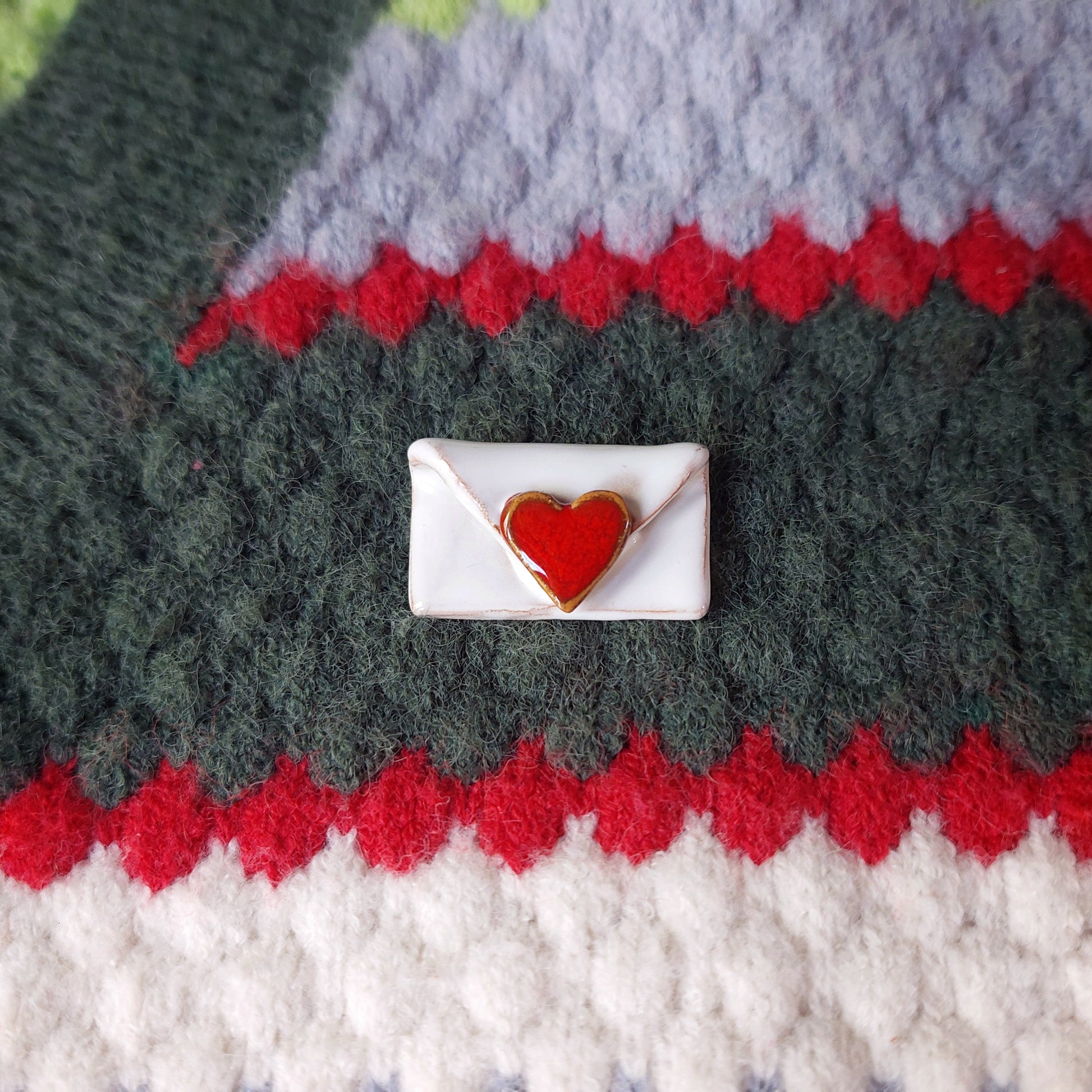 Spilla Bustina con cuoricino in ceramica bianca e rossa con accessori in metallo.