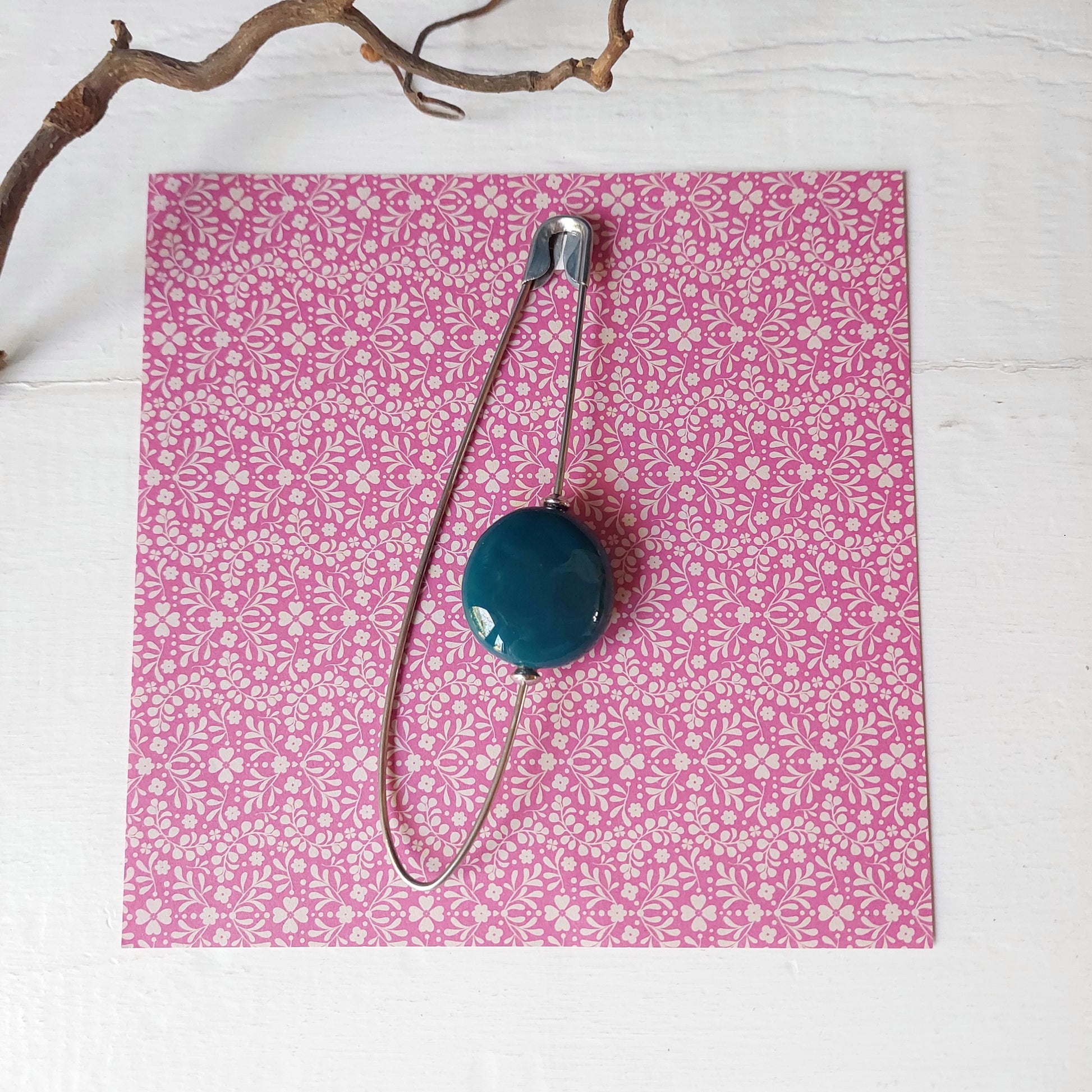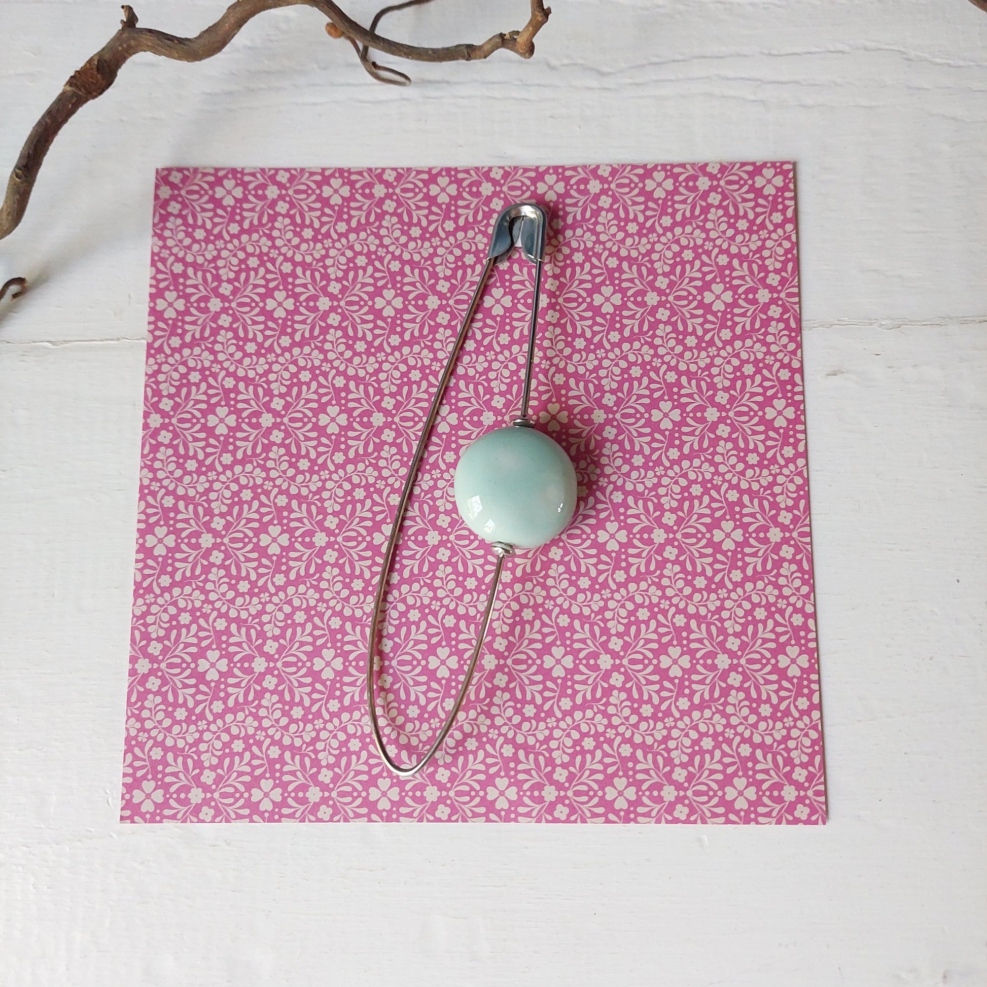 Spilla con perla in ceramica verde in tre varianti colore, con accessorio in metallo.